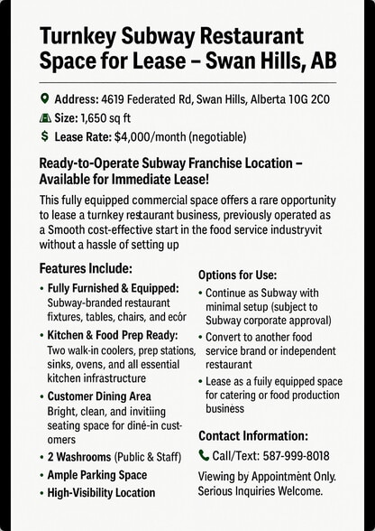 Main Street Location – Swan Hills, Alberta. 4619 Federated Rd, Swan Hills, AB T0G 2C0. Ready for Your Business! Versatile commercial building in the heart of Swan Hills — ideal for restaurants, retail, or specialty services. High visibility with maximum exposure! A building that was most recently operating as a Subway sandwich shop. This turnkey set up is perfect for a restaurant or perhaps another franchise to move in. Property Features: Freestanding commercial building Drive-thru setup (ideal for food service) Large front windows & visible signage On-site parking Full-service utilities available Size: Approx. 1650 square footage Lease Rate: $4,000 Monthly Rent + utilities (Negotiable) Availability: Immediate Ideal Uses: Restaurant, café, retail outlet, dispensary, or any growing local business. Contact Owner Directly – Agents are welcome Name: Biliqis Phone: 587-999-8018 Located in a growing community with local business demand!