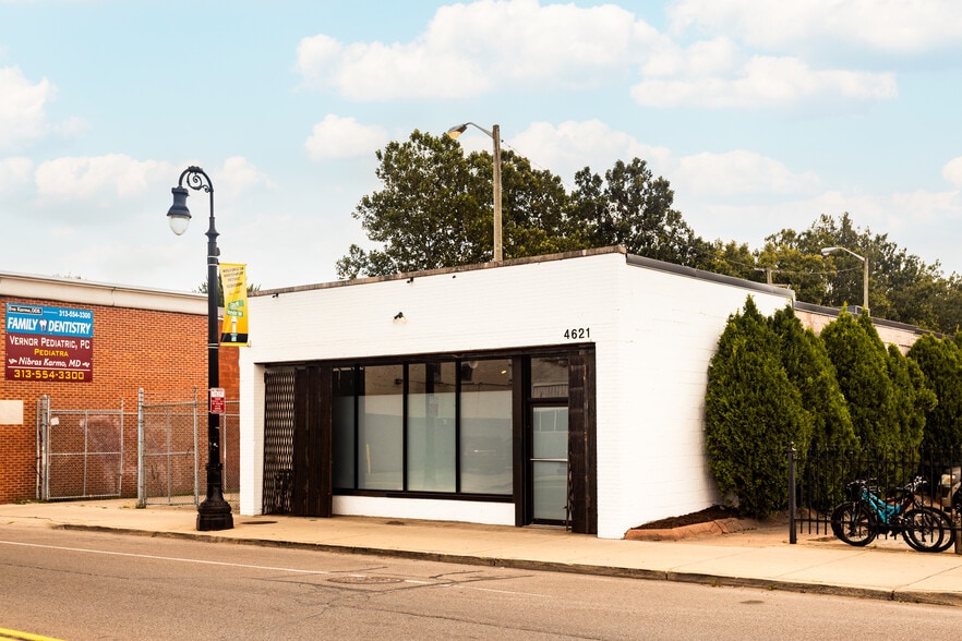 4621 West Vernor Highway is a designfocused building available for sale or lease, offering a highly refined and flexible environment well-suited for creative, office, or studio use. Fully renovated in 2017, the property features an open floor plan with approximately 14-foot exposed ceilings, polished original concrete floors, and an attractive full-height storefront with floor-to-ceiling windows, providing exceptional natural light. 2 Improvements include a new Firestone rubber roof with a 20-year warranty, all-new exposed spiral ductwork; a full kitchen; a professional soundproof recording/podcast studio; a second bathroom; large utility and storage closets; and comprehensive camera and motion-sensor security systems. The building also includes private, gated rear parking, which may alternatively function as secured outdoor space.