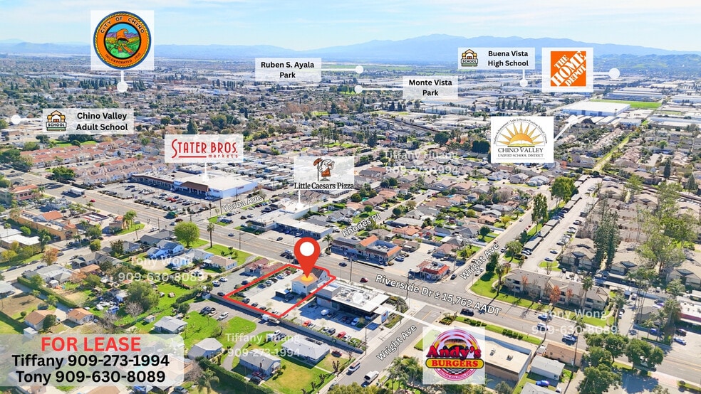 • Free Standing Retail / Office Building • Prime frontage on Riverside Drive with strong daily traffic counts • Surrounded by residential neighborhoods and community amenities • Strong daytime population and Local customer base • Excellent access to CA-60, CA-71 • Flexible CG zone allows a wide variety of commercial, office, and restaurant uses to serve residents, employees, and visitors. • Suitable for Lash Extension, Private Office, Loan Office, Escrow Office, Legal Office, Law Office, Counseling Office, Therapy Office, Real Estate Office, CPA Office, Tax Preparation Office, Insurance Agencies, Property Management Office, Notary Services, Financial Planning and Wealth Management Office, Architecture Office, Design Studios, Staffing and Recruiting Firms Call/Text for Details: Tony: 909-630-8089 Tiffany: 909-273-1994