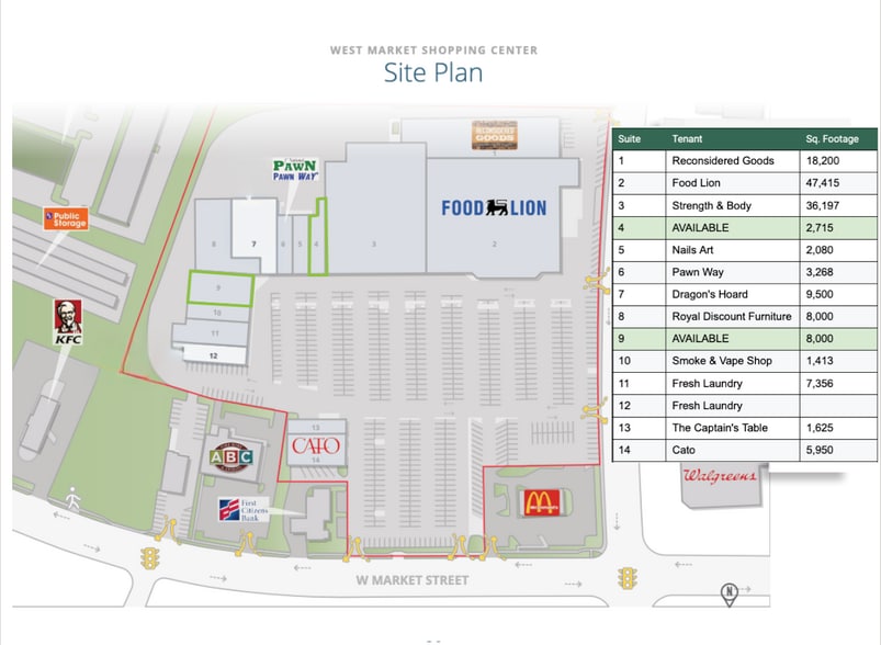 | Total Space Available | 10,715 SF | Frontage | 822’ on W Market St |