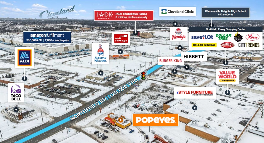 The property sits along Northfield Road, a primary commercial arterial with strong commuter traffic and direct connectivity to I-480 and I-271. The site benefits from excellent visibility, dedicated drive-thru access, and convenient ingress/egress—key attributes that support high-volume QSR performance. The surrounding area is undergoing significant redevelopment, anchored by the transformation of the former Randall Park Mall site into a major industrial hub featuring an 855,000+ SF Amazon fulfillment center employing more than 2,600 workers. Additional planned industrial development continues to drive daytime population and employment-based traffic to the corridor.