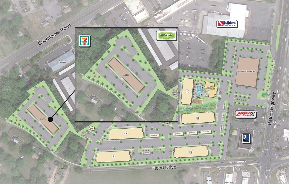 Hood Drive Pad (±2.6 Acres): Ideally positioned for a Hotel, but open to alternative uses such as Senior Living, or even Self Storage, with excellent visibility and direct proximity to the new Fredericksburg Health Care Center.