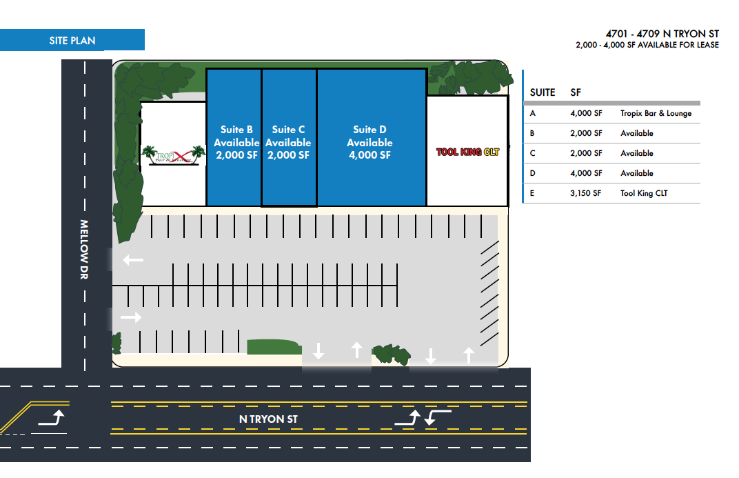 4701 - 4709 N Tryon St is a 13,150 SF shopping center in close proximity to thousands of recently delivered, under contraction and proposed multi family projects and mixed use developments. • Located at the intersection of heavily trafficked N Tryon street (26,000 AADT) and Mellow Street • Excellent visibility with drive up surface parking and full movement access • Within minutes to major thruways including W Sugar Creek Rd, Eastway Dr, and I-85 • Convenient access to Sugar Creek Lightrail Station • New roof, new landscaping, exterior paint scheduled to be complete by Q3 2025