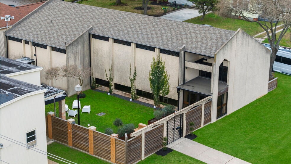 A rare adaptive-reuse opportunity featuring a former chapel paired with a secondary building on a private,landscaped site in central Galveston.Built in 1970,the primary structure offers a dramatic interior defined by vaulted wood ceilings,exposed beams,and preserved stained-glass clerestory windows that fill the space with natural light.The architect,Tibor Beerman,also designed the Galveston County Courthouse,adding architectural significance.The open studio-style layout includes defined living areas,a glass-enclosed workspace,kitchen, bathroom,and multiple flexible sleeping or creative-use zones,along with mezzanine space overlooking the main interior.A large stained-glass installation displayed in the entry serves as a striking focal point.The secondary building features a spacious 1st floor workshop with upper-level areas ready for future build-out,connected by a central courtyard.Historical documents and blueprints convey.2 structures total approximately 7,664 SF of adaptable space
