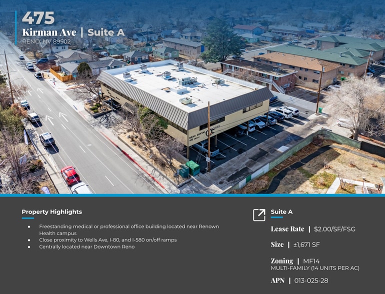 Dickson Commercial Group is pleased to present 475 Kirman Avenue, Suite A for lease. This ±1,671 square foot professional or medical office space is located in a freestanding building in central Reno, just minutes from Renown Health and the surrounding medical campus. The suite features a functional layout including a reception area, waiting room, check-in/check-out area, breakroom, restroom, and multiple private offices. The property offers excellent accessibility with close proximity to Interstate 80 and Interstate 580, as well as convenient connections to Wells Avenue and Downtown Reno. Its central location and flexible zoning make it well suited for a variety of professional or medical office users seeking a convenient and accessible location in the Reno market.