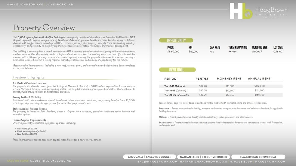 This 5,000 square foot medical office building is strategically positioned directly across from the $400 million NEA Baptist Regional Hospital campus, one of Northeast Arkansas's premier healthcare hubs. Located along E. Johnson Avenue, with traffic counts exceeding 33,000+ vehicles per day, the property benefits from outstanding visibility, accessibility, and proximity to a rapidly expanding concentration of retail, restaurant, and medical development.