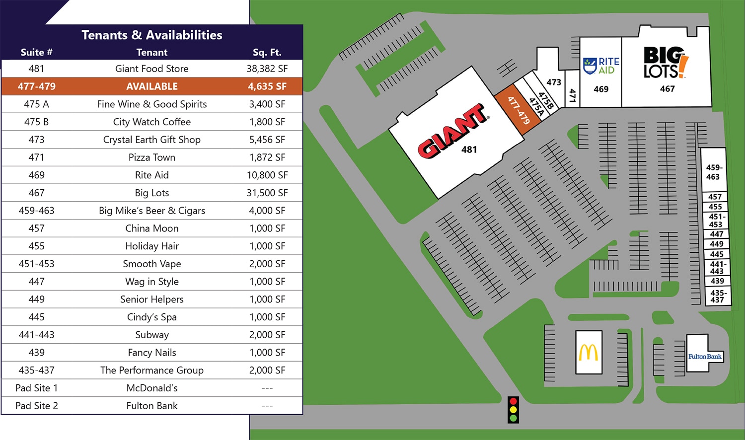 Join this neighborhood shopping center anchored by a 38,382 SF well-established and successful Giant Food Store. Situated along Route 422, the main east-west corridor between Hershey and Lebanon, the center offers excellent visibility and easy access to a diverse residential community and local amenities, including Lebanon Valley College. The area has experienced significant growth in distribution in recent years with the addition of several large warehouses. Notable facilities include the Hershey Co. Fulfillment Center, an 800,000 SF facility that packages and stores snack-size products from Hershey’s manufacturing network; EaglePoint, a 1.1 million SF warehouse; and the DHL Clear Spring Logistics Park, which contains multiple warehouses. The shopping center features a strong mix of national and regional retailers, including Rite Aid, McDonald’s, Subway, Fine Wine & Good Spirits, Fulton Bank, and more. This center presents an ideal opportunity for food retailers, medical services, health and wellness businesses, and other service-oriented ventures. The property is professionally managed.