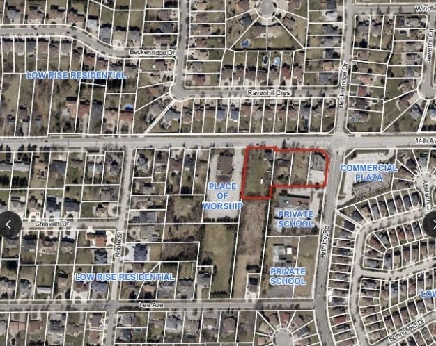 The property is located at the southwest corner of 14th Avenue and Brimley Road in the City of Markham. The assembled site provides approximately 139 metres of frontage along 14th Avenue and 60 metres along Brimley Road.