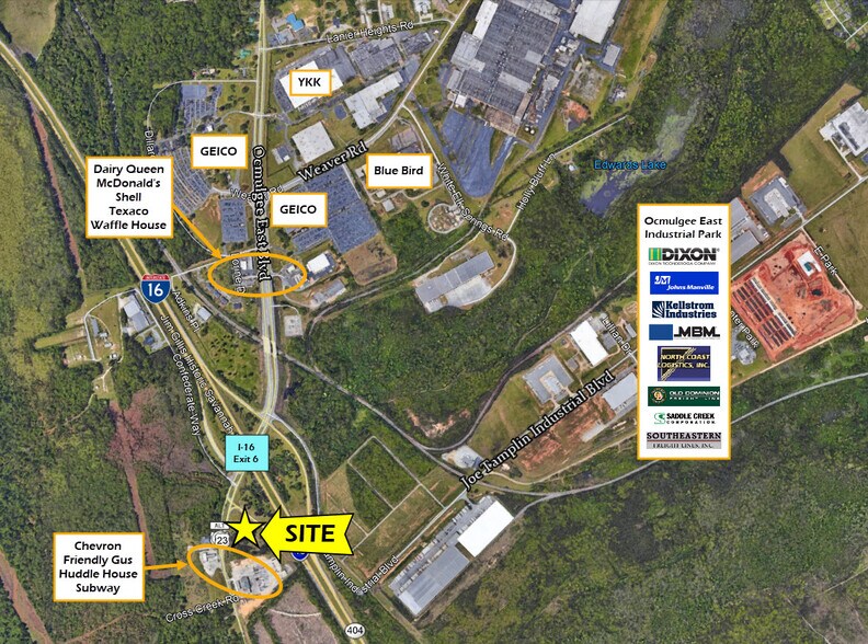 1.2 acres located at the corner of Ocmulgee East Boulevard and I-16 (Exit 6) near GEICO, YKK and Ocmulgee East Industrial Park. Water and sewer available.