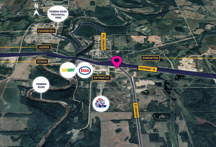 Excellent access to major highways including Highway 16, Highway 16A and Highway 22 (Cowboy Trail) Short drive time to Evansburg, Wabamun Lake and Drayton Valley Surrounding businesses include: ESSO Gas Station, Subway, Journeyman Inn, Lighthouse R