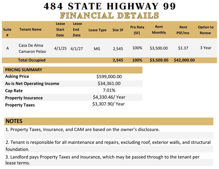 This fully leased restaurant investment offers a steady income stream with a well-established tenant in place. Situated directly on State Highway 99, the property benefits from high daily traffic and excellent visibility. The 2,545 SF building sits on a generous 36,590 SF lot, providing potential for future enhancements. With a 7.01% cap rate and a secure lease through 2027, this opportunity delivers immediate cash flow in a growing market.