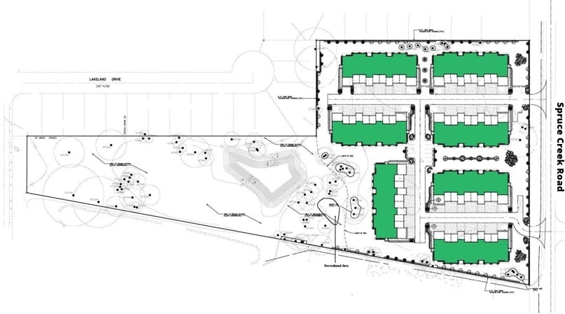 Spruce Creek Commons spans 9.13+/- acres, is zoned 12 dwelling units per acre, and has an attached conceptual site plan for 50-60 townhome lots.