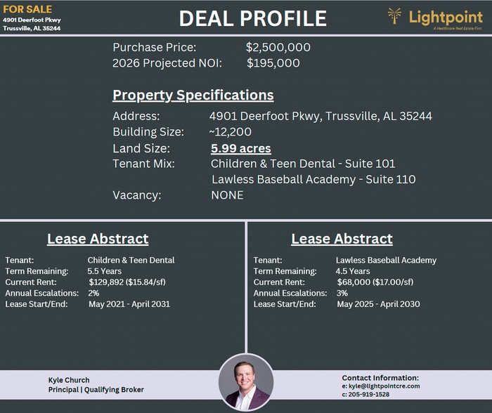 This offering provides investors with durable income, healthcare exposure, and land upside in a proven Birmingham-area corridor.