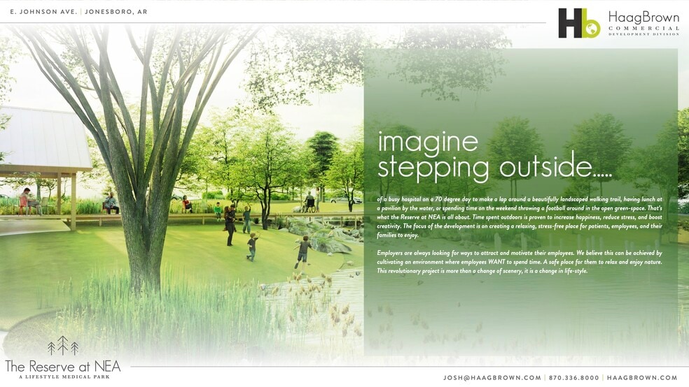 Haag Brown Commercial Real Estate & Development is excited to expand its partnership with NEA Baptist through The Reserve at NEA—an 11-acre, lifestyle-focused medical development designed as a seamless extension of the NEA Baptist Health System Campus. Following the success of The Reserve at Hill Park, the community’s first lifestyle-oriented office park, Haag Brown is bringing the same vision to this premier location. “The Reserve at Hill Park has been so well received that we want to duplicate the entire project next to the largest master-planned, integrated healthcare campus in our trade area. Our belief in quality of life and wellness will be exemplified through this project.” - Joshua Brown, Principal of Haag Brown Development This thoughtfully designed development features two existing buildings, three potential building sites, individual patio systems, a multi-use walking trail connecting directly to NEA Baptist, multiple water features, a lakeside pavilion, and three separate green space areas. Among the available sites, a 0.56-acre lot presents a prime opportunity for medical or office users looking to establish a presence in this premier setting. The owner, an experienced developer, can deliver up to 3,500 SF quickly—offering the option to purchase the shell or build to suit based on specific needs. The Reserve at NEA is ideal for medical companies seeking proximity to NEA Baptist, offering the only location in Jonesboro with direct pedestrian and vehicle access to the hospital. *Please note, all transactions are subject to approval of the user by the developer and NEA Baptist. The strictest covenants and restrictions are in place. Owner is the developer and would also consider a Build to Suit in which the same approval process applies.