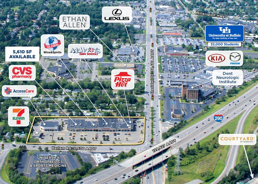 Located at the intersection of Sheridan Drive and Harlem Road, directly off the I-290, Sheridan Harlem Plaza provides a mix of convenient one-stop shopping the more than 325,000 residents within five miles. Nearby points of interest include DENT Neurologic Institute, the largest out-patient neurology practice in the United States; UBMD Orthopaedics & Sports Medicine; numerous car dealerships, including Lexus, Cadillac, Nissan, Kia, Mazda and Hyundai; and the University at Buffalo, home to 32,000 students.