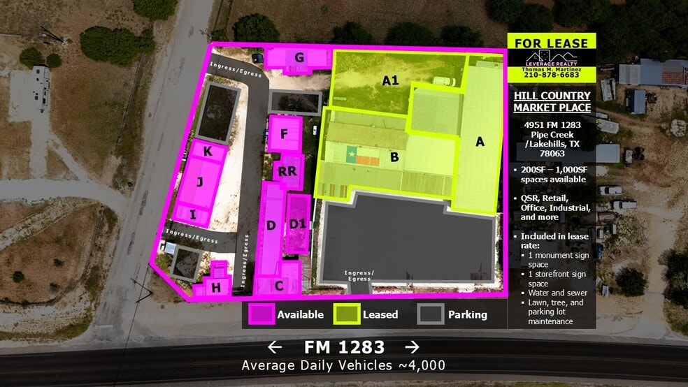 •Located in the high growth northwest corridor of San Antonio •Positioned between Bandera, Boerne, Helotes, San Antonio/Alamo Ranch, and Castroville •Mixed use location offers flexibility for many business types with visibility and accessibility to/from FM 1283 •280 feet of FM 1283 frontage with about 4,000 vehicles per day •Use options include quick service restaurants, retail, office, service businesses, automotive, industrial, and more •Competitive lease rate includes: water, sewer/septic, lawn/tree/parking lot maintenance, 2’x4’ monument sign space facing FM 1283 traffic, and a storefront sign space (size varies by space) •Several turnkey second generation spaces •Several shell/frame spaces allowing for your vision and creativity •Utilities on site •All spaces have access to common area restrooms •Fully illuminated grounds for business hour flexibility and 24/7 visibility •Fully fenced perimeter with gates for access control •Site plan allows for several ingress/egress options and parking areas for ease of access •Anchored by The Eagle’s Nest, a full service bar and grill that’s been in business for years providing an established customer base for the center •Several spaces undergoing make-ready now
