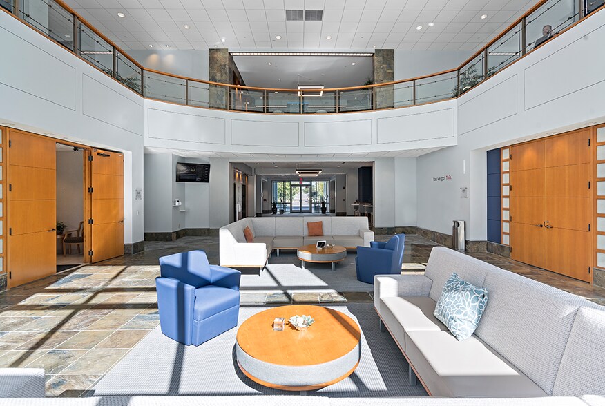 5 Walnut Grove Drive is a modern, three-story, multi-tenant office building featuring a dramatic atrium lobby with high-end finishes, prominent double door tenant entrances, outdoor seating area, an abundance of natural light from high ceilings and ample windows, and an outdoor terrace with iron furniture and umbrellas in a natural setting. 5 Walnut Grove Drive is in the Pennsylvania Lifestyle Campus and has convenient access to (11) SEPTA stops, easy access to (2) PA Turnpike entrances and routes 611 & 63.