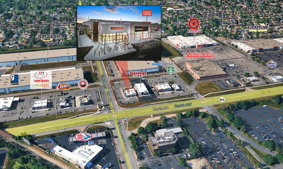 Prime endcap on heavily traveled W. North Avenue in Melrose Park Strong visibility and prominent building signage opportunity High-demand corridor with strong national co-tenants, including Chipotle and Buffalo Wild Wings GO Ideal for fast casual, service retail, medical, or specialty users Convenient access with full circulation and ample shared parking Surrounded by dense residential, retail, industrial, and daytime population drivers Benefits from steady traffic flow connecting Melrose Park, Elmwood Park, City of Chicago, Oak Park and River Forest