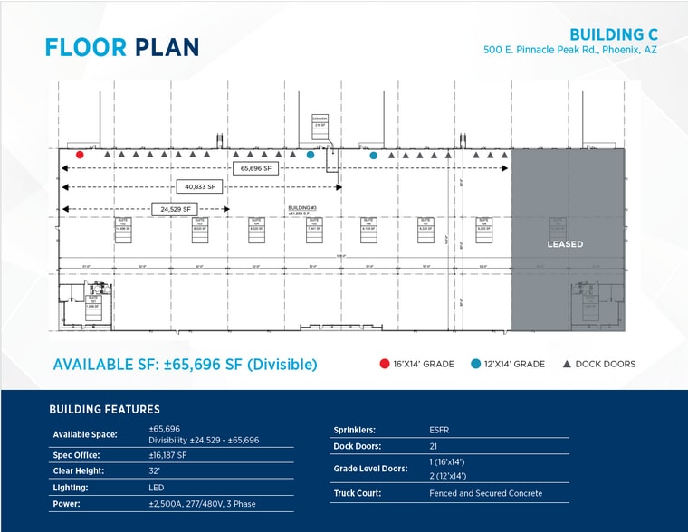 +/-92,065 SF Building Divisible to +/- 18,540 SF +/- 1,606 Spec Office 26 Dock Doors 4 Grade Level Doors (2) 12'x14', (2) 16'x14' 32' Clear 2,500 Amps, 277/480 Volt 3-Phase Power 185' Building Depth 52'x60' Column Spacing