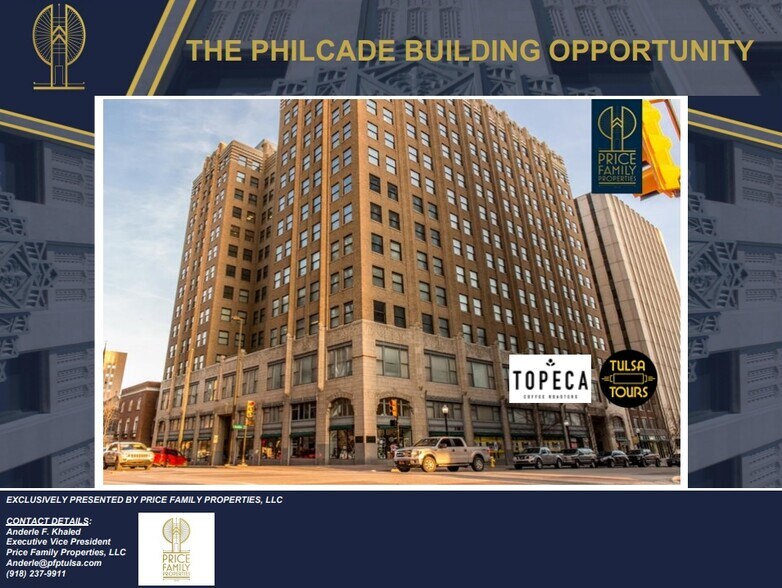 Located at Fifth Street and Boston Ave, the Philcade sits in Downtown Tulsa's business and financial district. The Philcade is compromised of three interconnected buildings that share a lavish lobby that was built in the shape of a "T' for Tulsa. The lobby has polished St. Genevieve marble, elaborate chandeliers, and arches that form a high ceiling covered in gold leaf and hand painted geometric designs. The exterior of the building is covered with carved terra cotta and cast iron veneer. Yet this art deco-style building is unarguably high-tech through its Energy Plant and Data Center space. The Philcade provides an excellent value for companies seeking secure, modernly-equipped space for the needs of their workforce.
