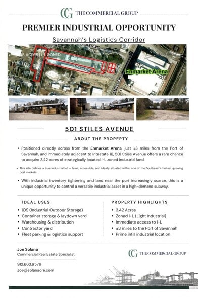 Premier 3.42-acre I-L zoned industrial land opportunity in Savannah's Logistics Corridor, currently home to Savannah Wood Preserving Co., an active wood treatment facility. Located directly across from Enmarket Arena and immediately adjacent to Interstate 16, with ±3 miles to the Port of Savannah. This level, fully accessible site is ideal for continued industrial use, IOS (Industrial Outdoor Storage), container storage, warehousing & distribution, contractor yard, or fleet parking. Existing improvements related to the wood treatment operation may convey. Seller is fee-simple owner. Contact listing agent to inquire. Parcel IDs: 20047 14004, 20047 14005, 20047 14007, 20047 14008, 20047 14010, 20047 14011, 20047 21011, 20047 22003.