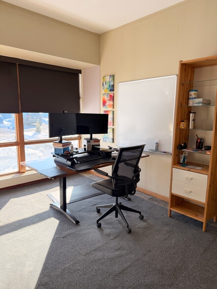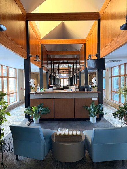 This property features a striking two-story interior atrium with exposed timber beams, abundant natural lighting, and thoughtfully designed common areas that create an elevated, professional environment.