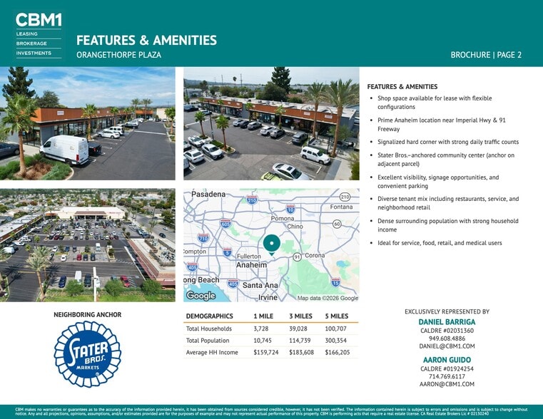 Orangethorpe Plaza is a well-established neighborhood shopping center in Anaheim offering multiple shop spaces for lease. This community-oriented plaza provides an ideal setting for restaurants, retail, personal services, and professional uses. With a strong tenant mix, excellent visibility, and convenient parking, the property offers businesses the opportunity to thrive in a high-traffic corridor surrounded by established rooftops and daytime population. Strategically located at the signalized intersection of E Orangethorpe Ave & Kellogg Dr, the center benefits from strong traffic counts and convenient access to both Imperial Highway and the Riverside (91) Freeway. The property is situated in a dense trade area with strong demographics, robust household income, and proximity to residential neighborhoods, employment centers, and regional retailers. The surrounding Anaheim/Placentia/Fullerton submarket continues to see growth in both residential and commercial development, making Orangethorpe Plaza a prime choice for retailers looking to expand in North Orange County.