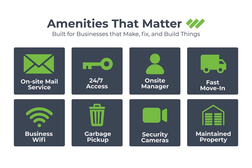 - ROLL-UP DOOR + PRIVATE ACCESS: Every unit includes a roll-up door, private entry, and private restroom for convenient day-to-day operations.