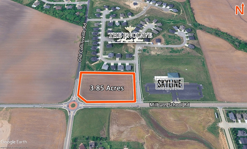 Excellent corner development opportunity near new residential neighborhoods and O’Fallon Township High School’s freshman campus. Utilities: Water – Located west side of Old Collinsville Rd. South side of Milburn School Rd; Sewer – Located south side of Milburn School Rd. in Savannah Hills; Natural Gas – Located south side along Milburn School Rd; Electric – Located along Old Collinsville Rd. Would be a great site for a retail development or small office park.