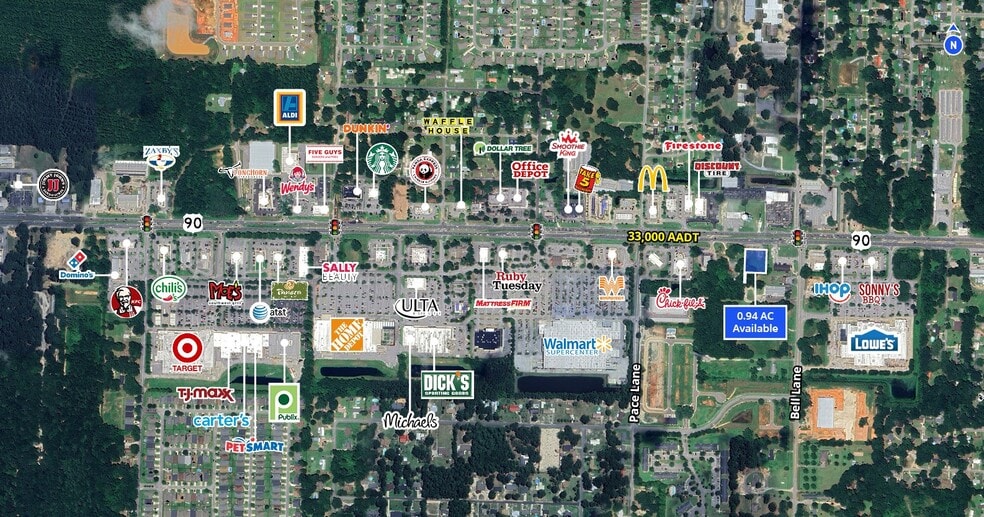 5063 US-90 in Pace, FL offers a ±0.94-acre retail pad for ground lease or build-to-suit, ideally positioned for QSR, retail, bank, automotive, or restaurant users. The site boasts excellent frontage and visibility along US Highway 90, with 33,000 vehicles passing daily, and is surrounded by major national retailers. Located in a rapidly growing submarket and just minutes from Santa Rosa Medical Center, this property provides a prime opportunity for new retail development in a high-traffic, high-growth area.