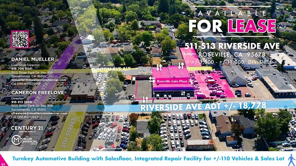 "This location provides one of the most attractive automotive sales and repair services opportunities in the dynamic downtown Roseville grid. The building is situated in the heart of Roseville south of Douglas Blvd. and conveniently just minutes north of I-80 which provides access to HWY 160, 99 & 50. Consisting of +/- 11,000 SF of flex building space with available auto sales offices, auto showroom spaces, and +/- SF 3,800 SF available for an integrated auto repair facility and an area for custom window tinting. The wide range of available amenities include frontage and monument signage, three roll-up doors, wide swing front doors, tenant-controlled HVAC, 24-hour access, and the location is surrounded by prime access points to enable access to an immediate new client network. The property is located near a dense residential housing area and nearby a multitude of retail users such as Hertz Car Rentals, Maaco Auto Body & Painting, Chevron, Starbucks, Jack in the Box, Panda Express, 7-11 Convenience Store, and Kaiser Permanente. With its proximity less than a mile from Interstate 80, retail, auto sales and services, dense residential housing, and convenient ingress and egress to the property from Riverside Ave. this well-maintained building makes this a desirable location for tenancy."