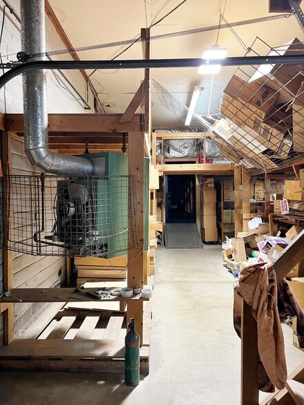 This property offers a unique combination of office and warehouse space, ideal for wholesale, distribution, or light industrial operations. The exterior features a metal-clad building with prominent signage ensuring strong visibility from the street. Inside, the office area includes multiple desks, filing cabinets, and organizational systems, creating a functional administrative hub.