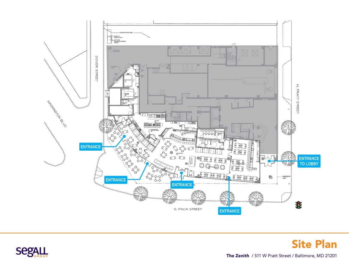 The Zenith sits on the prominent corner of West Pratt Street and South Paca Street in the heart of Baltimore’s central business district. The property is a short walk to the University of Maryland Medical Center (789 beds; over 9,000 employees; 1,200 students), Camden Yards (approx. 2 million visitors per year), CFG Arena (approx. 1 million visitors per year), and the Baltimore Convention Center (approx. 500,000 visitors per year). The CBD offers a mix of major attractions, dining, and bars, positioning the Zenith as an attractive destination for a wide range of restaurants and retailers seeking space in Baltimore City.