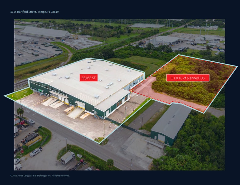 Building A at 5115 Hartford Street in Tampa offers 66,056 square feet of industrial space available for sale or lease, complemented by ±1.0 acre of planned industrial outdoor storage, making it well-suited for manufacturing or heavy industrial users. The property provides robust infrastructure, including 6,500 amps of heavy three-phase power, clear heights ranging from 18 to 24 feet, and multiple cranes—one 1-ton, one 3-ton, and one 5-ton—to support intensive operational needs. Loading is highly functional, with a recessed truck well, two oversized 24’ x 14’ drive-in doors, and two additional dock-high doors offering versatile access for distribution and production workflows. The building includes 3,420 square feet of office space, with planned improvements such as refreshed offices and restrooms, LED lighting, floor cleaning, pit filling, and upgraded exterior paint. Positioned in a strategic Tampa industrial corridor with direct access to US-41 and short drive times to US-301, I-75, Port Tampa Bay, Downtown Tampa, and Tampa International Airport, the property provides exceptional regional connectivity and immediate functionality for users seeking a well-powered, crane-served facility with outdoor storage capacity.