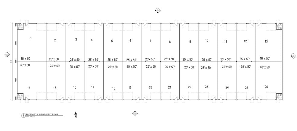 - Units can be combined and include at least one 14-foot drive-in door, a private entrance, a 24-foot clear height, and 480-volt, 3-phase heavy power.