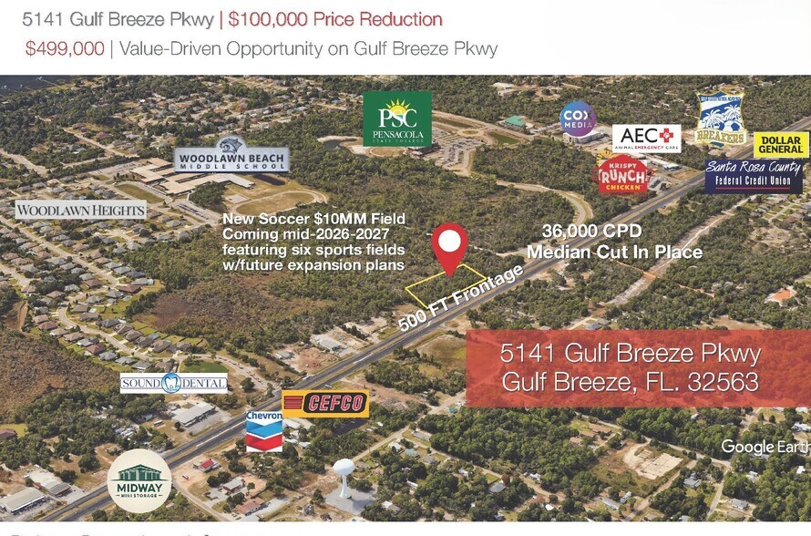 2.04± AC commercial parcel features ~500’ of frontage along Gulf Breeze Parkway in a high-growth corridor serving Gulf Breeze and South Santa Rosa County.