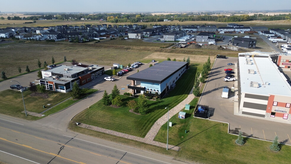 Constructed in 2014, the building features a functional main-floor office layout with upper-level storage, abundant surface parking, and significant undeveloped land on the west portion of the site, offering potential for future expansion. The property is easily accessed from both Highway 2 (QEII) and Highway 2A, providing strong visibility and regional connectivity.