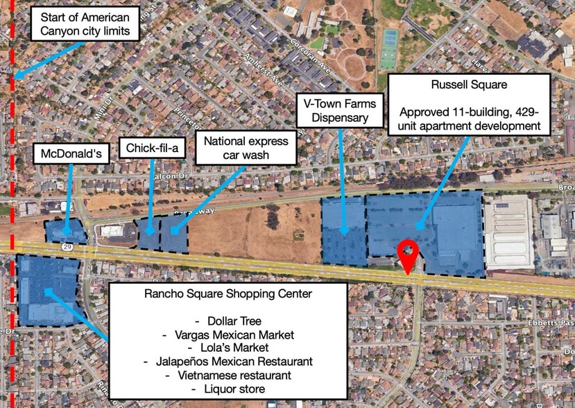 1,883 SF Retail Space Available For Lease Property Highlights: - Prime high-visibility hard-corner location at fully signalized Hwy 29 (Sonoma Blvd) - 44,000+ vehicles per day along Hwy 29 - Significant frontage along Hwy 29 - gateway to Napa County - Prominent monument signage available for tenant branding - First retail stop off Hwy 37 en route to Napa Valley - Dedicated ingress/egress lanes for easy access - Adjacent to new 3-lane Chick-fil-A & national express car wash - 429 new multifamily units approved on neighboring property - Strategically located between Vallejo & American Canyon - Full 2025 renovation - new roof, paint, landscaping, trash enclosure & parking lot restriping