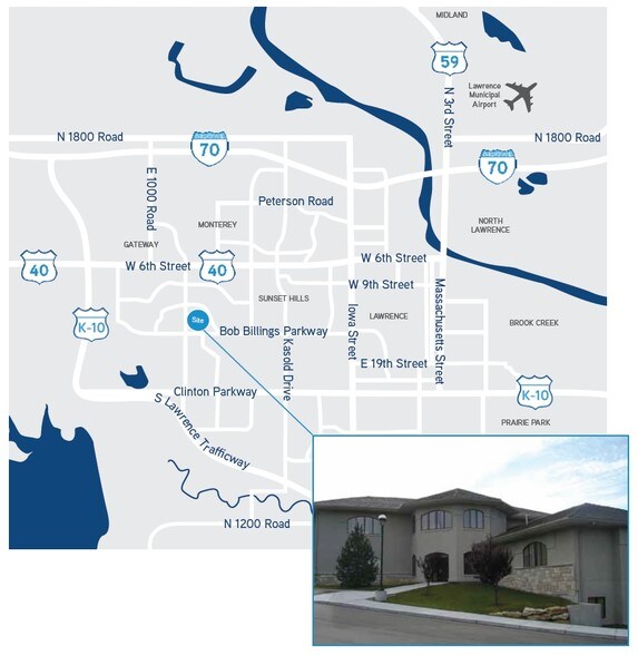 • Situated west of Wakarusa Drive near the K-10 Bypass at the northwest corner of Bob Billings Parkway and Legends Drive • Main-level suite • Year built/renovated: 2000/2015 • Access to shared main-level conference room and common area restrooms • Zoning: M-1 • Opportunity for monument signage • Enjoy the perks of a professionally-maintained building with beautiful curb appeal