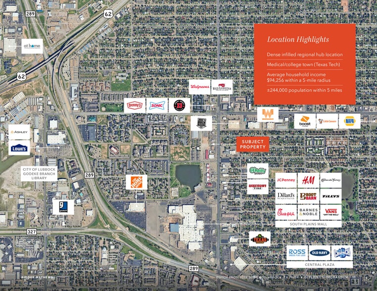 oil services, healthcare, home building, medical, and Texas Tech University. Favorable demographics further strengthen the market, with a 5-miles population exceeding ±244,000 and an average household income over $94,000. The property offers convenient access to US-62, US-327, and Loop 289 ensuring excellent regional connectivity. Its infill location is surrounded by established residential neighborhoods, national retailers, and popular dining destinations, ensuring long-term tenant success