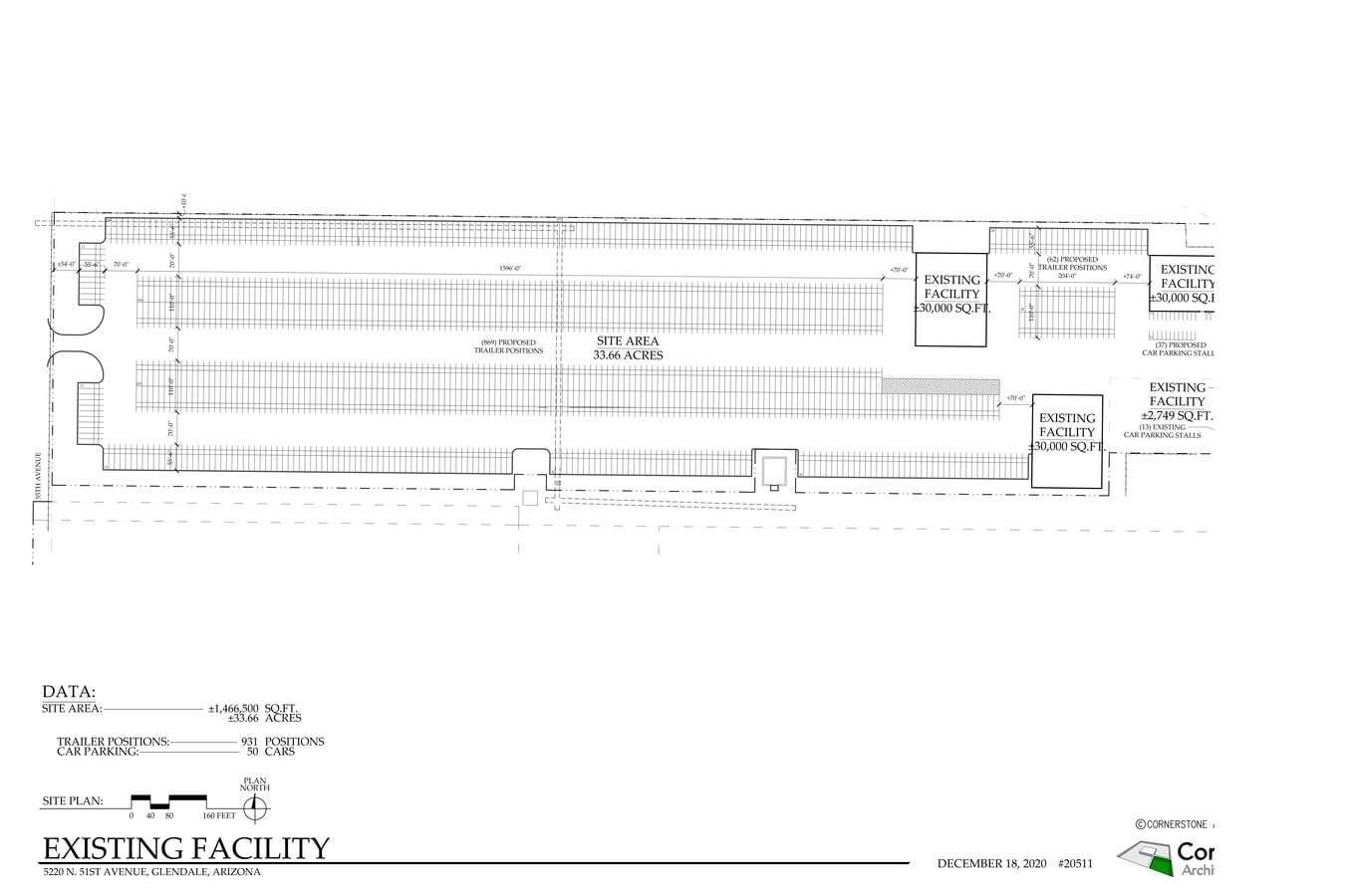 - The property has 950 trailer stalls, five drive-in bays, truck scale, secure storage, and rail capability.