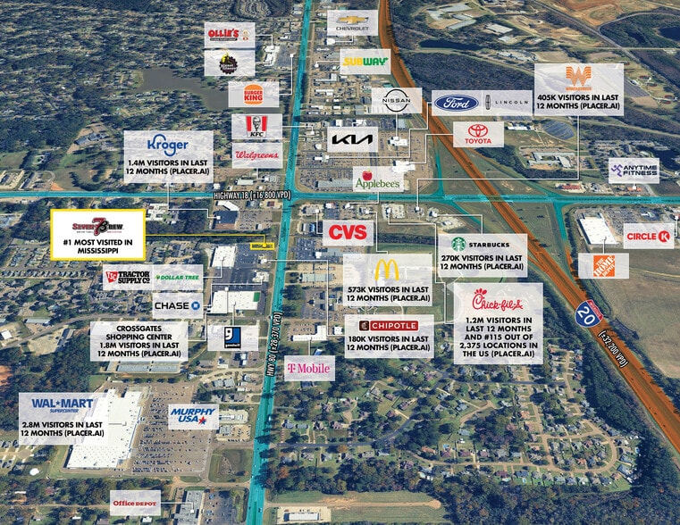 The property is strategically positioned as an outparcel to Crossgates Shopping Center, which attracts more than 1.8 million visitors annually and offers frontage along US Highway 80 (28,370 VPD). The surrounding retail corridor is further enhanced by immediate access to Interstate 20, proximity to ‘JAN’ International Airport, and adjacency to dominant national retailers including Walmart Supercenter and Kroger. With more than 62,900 residents within five miles of the subject property and over 420,000 annual visits in 2025 (Placer.ai), this 7 Brew Coffee investment represents a highly trafficked, well-located NNN asset backed by a best-in-class QSR tenant, long-term lease security, and exceptional real estate fundamentals.