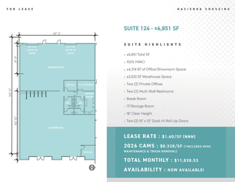 - 2026 CAMs: $0.328/SF (*INCLUDES HVAC MAINTENANCE & TRASH REMOVAL)
