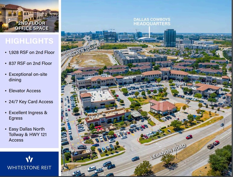 The Shops at Starwood Office is located on the SWC of Dallas North Tollway and Lebanon Road, This easy access building is the perfect location for your small executive office. Free parking, large windows, 24/7 key card access all surrounded by boutique shopping and dining experiences. This office/retail center is surrounded by luxury living and a robust daytime workforce. The current tenants provide a mix of convenience and elegance for the office tenants. Whether you need a restaurant to celebrate, or a quiet place for interviews, the award-winning restaurants, including TruFire, Kotta Sushi, J Theodore, Bottled in Bond and Up Inspired Kitchen are only steps from your office. The many other services, Alaam the Salon, The Lash Lounge, Eden Spa, Pose Yoga, Club Pilates and other retail therapy makes this a Work, Eat Play location.