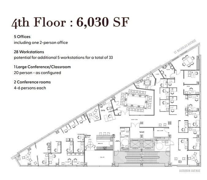Current space configuration accommodates: 5 Offices (including one 2-person office) 28 Workstations (with the potential for an additional 5 workstations for a total of 33) 1 Large Conference/Classroom (20 person- as configured) 2 Conference rooms (with 4-6 persons each) Move-in ready full-floor office with strong transit access and neighborhood-serving NY Presbyterian Hospital and Columbia University Medical.