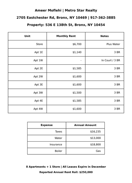 An exceptional opportunity to acquire a high-potential mixed-use investment property in the heart of the Bronx. Located at 536 East 138th Street, this solid income-producing building consists of 8 residential apartments and 1 ground-floor retail store, providing diversified revenue and long-term upside in a growing corridor.