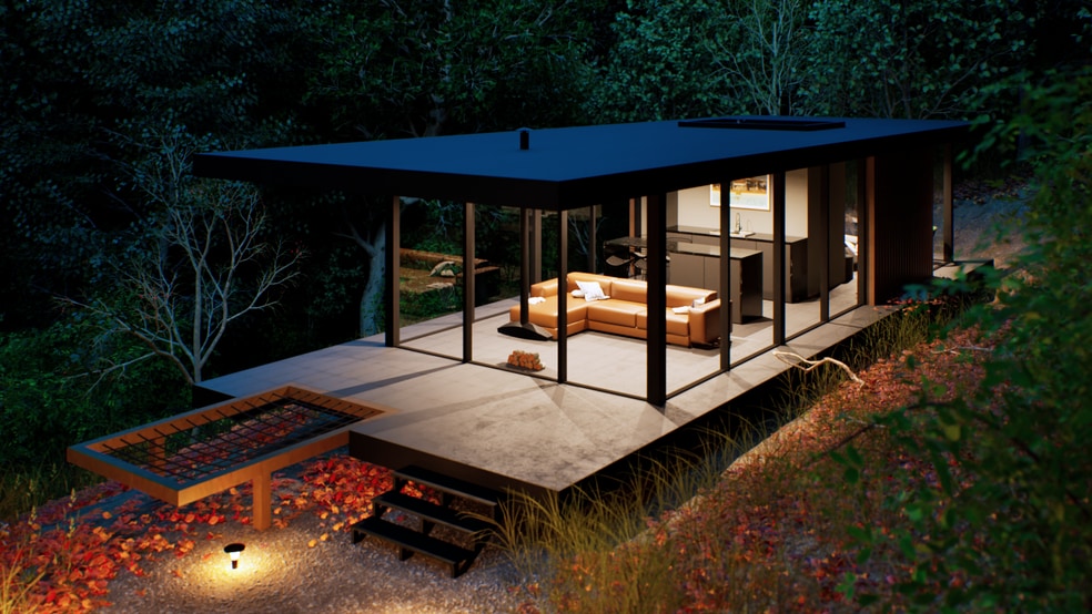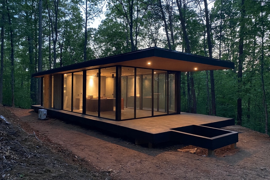 Nine architect-designed, glass-walled pavilions on 60 wooded acres