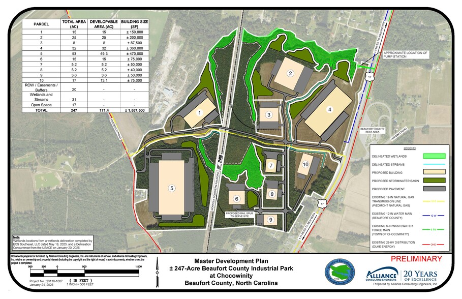 186 Developable acres in fully served Industrial Park with Norfolk Southern Class 1 Rail line, Duke Energy 23kV line, Piedmont Natural Gas, Water/Sewer, Telecommunications with direct access to US Highway 17. Completed due diligence.