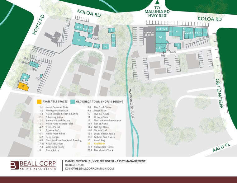 Old Koloa Town is a 24,000 square foot, historic street-front shopping village located in the heart of Kauai’s south shore. The property is within the Poipu resort district which includes 3,517 visitor lodging units and eight world-class resorts. The Kauai retail and visitor market thrived in 2025, welcoming 1,419,943 visitors. This historic town has become a popular hub for both visitors and locals, offering a carefully curated mix of retailers and restaurants. KAUAI HIGHLIGHTS: • Visitors to Kauai in 2025: 1,419,943 • Kauai visitor spending was $2.93B in 2025 • Kauai average daily visitor census: 28,534 • Visitor per person per day spending on Kauai: $281.30