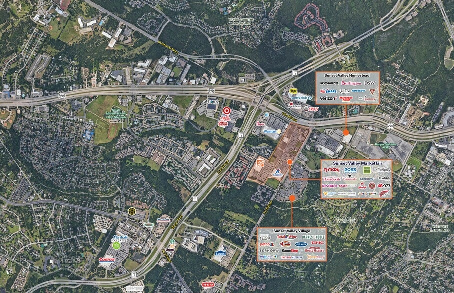 Sunset Valley Marketfair is an expansive retail center with over 30 storefronts and dedicated anchor tenants. Sunset Valley Marketfair offers easy access to major thoroughfares, high traffic counts, and ample parking. The shopping center brings 3.8 million visitors per year, according to placer.ai. It is anchored by The Home Depot, Academy, T.J. Maxx, Homegoods, and Ross Stores. Because it is located in a dense residential area, the center experiences high traffic volumes, especially as people come home from work.